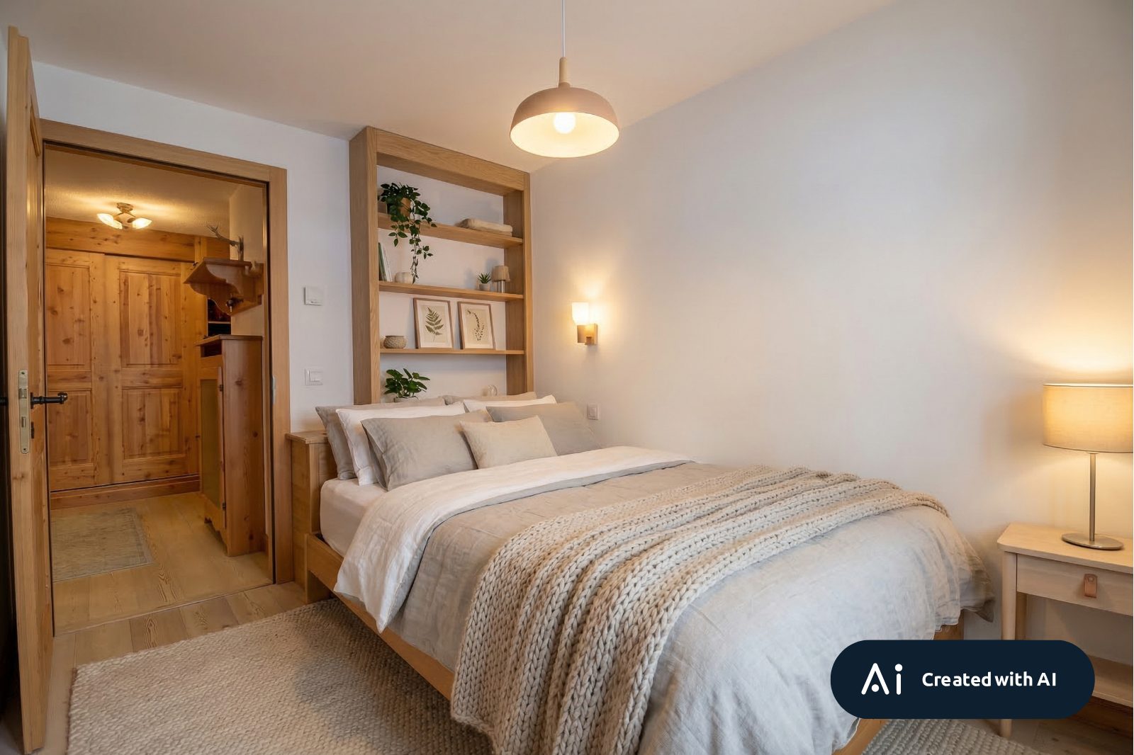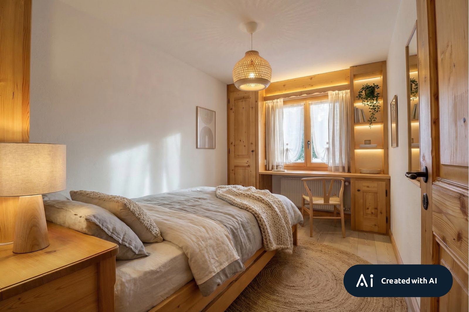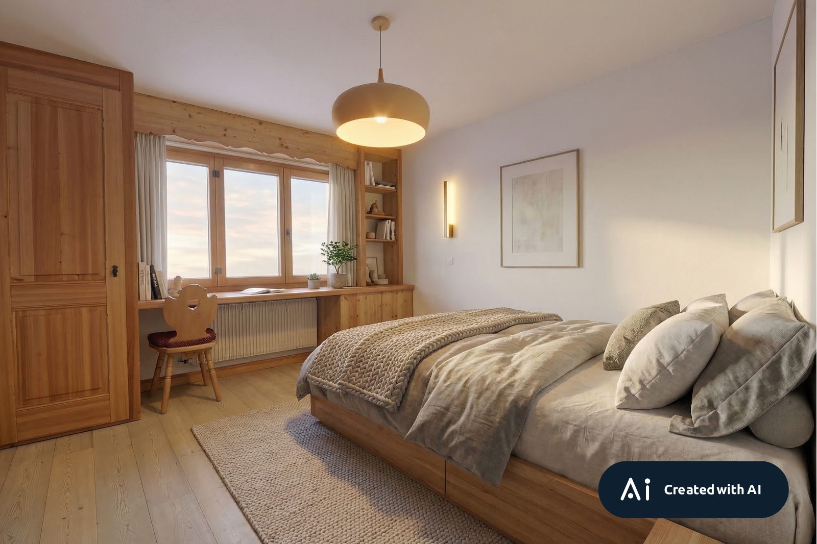 • Chambre parentale avec lit double, espace bureau et rangements intégrés.